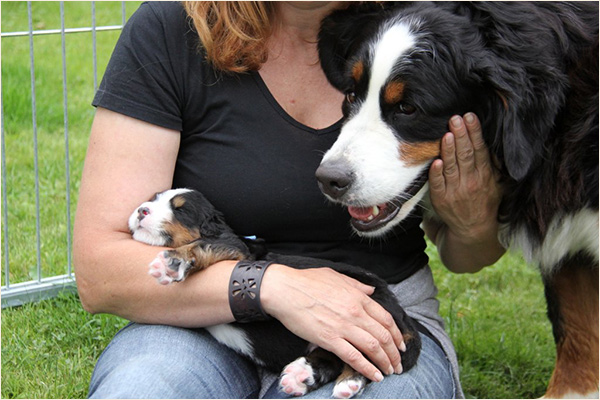 Auf der Decke will schon lange keiner mehr bleiben, selbst mit 3 Wochen zeigen die Kleinen, daß ihnen jegliche Unterlage einfach zu warm ist. Altersgerecht und nie überfordernd setzen wir nun erste akustische und optische Reize ein, …die PRÄGUNG beginnt ! Unsere ländliche Wohnumgebung bietet uns eine neue, interessante Geräuschkulisse, besonders jetzt, wo viele Erntefahrzeuge unterwegs sind. Drinnen im Haus sind unsere Bernerkinder sowieso von Geburt an bis zum Umzug ins neue Zuhause mit uns zusammen im Wohnraum, daher gehören alle Haushaltsgeräusche, Besuche und unsere Tätigkeiten von Beginn an ohnehin zur täglichen Routine.